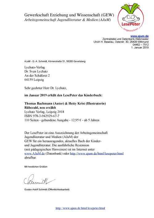 - Im Januar 2019 erhielt unser Kinderbuch "Rübezahl, für die Jugend erzählt" den LesePeter, klicken Sie auf den Brief, um ihn zu vergrößern. Der Buchtitel führt zu unserer Jugendbuchseite und bestellen können Sie das Buch direkt bei uns: Bestelllink "Rübezahl - für die Jugend erzählt"