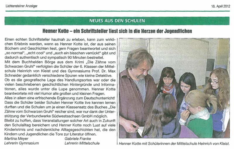Im Lichtensteiner Anzeiger erschien am 18. April ein Bericht über Henner Kottes Lesung vor Schülern der Mittelschule Heinrich von Kleist und des Gymnasiums Prof. Dr. Max Schneider.